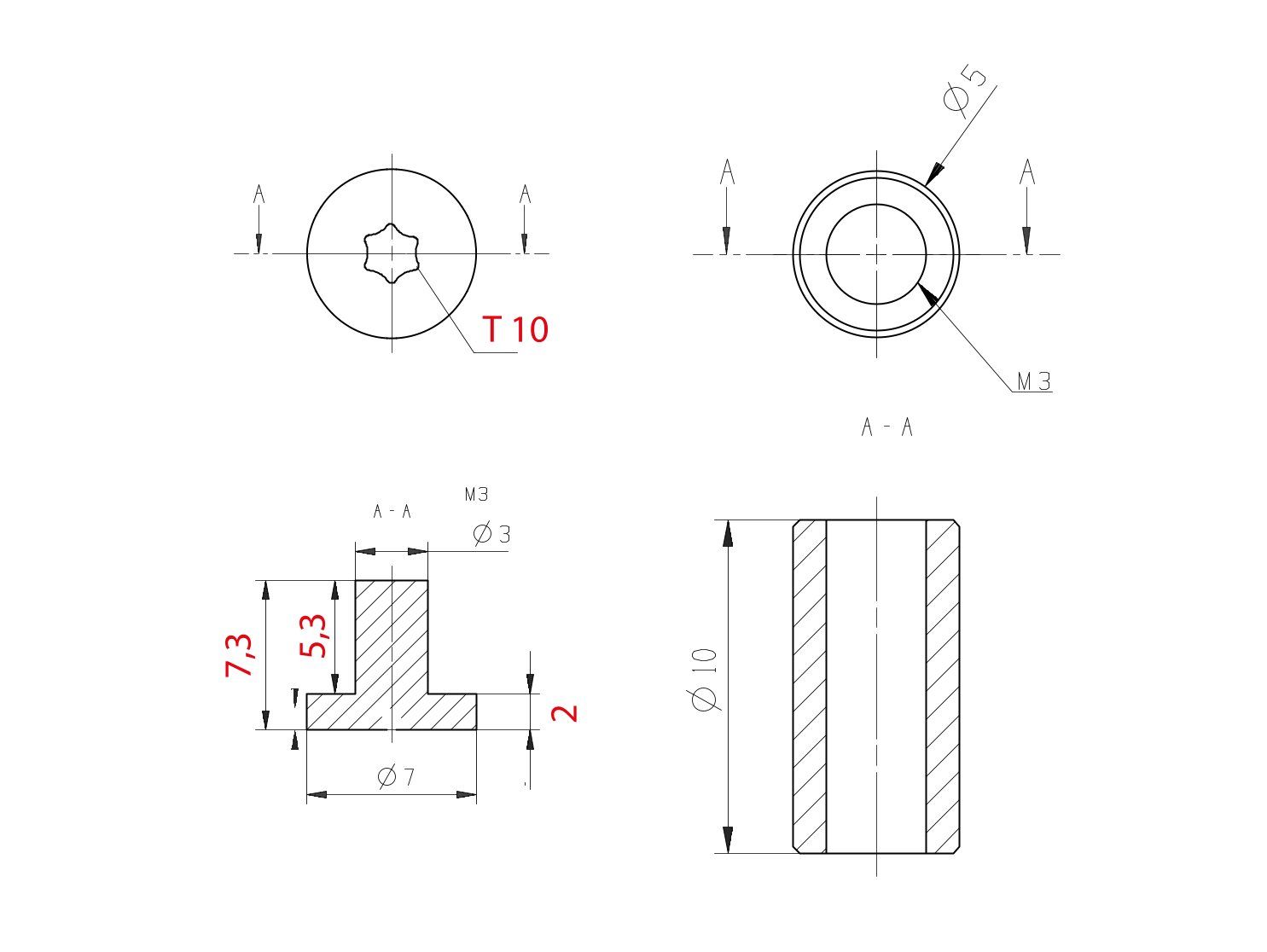 Nerezový středový čep průměru 4 mm se závitem M3 a délkou 10mm. 2 nerezové šrouby M3 s průměrem hlavy 7 mm a DLC povlakem. Celková délka před stažením je 22 mm. Torx T10.