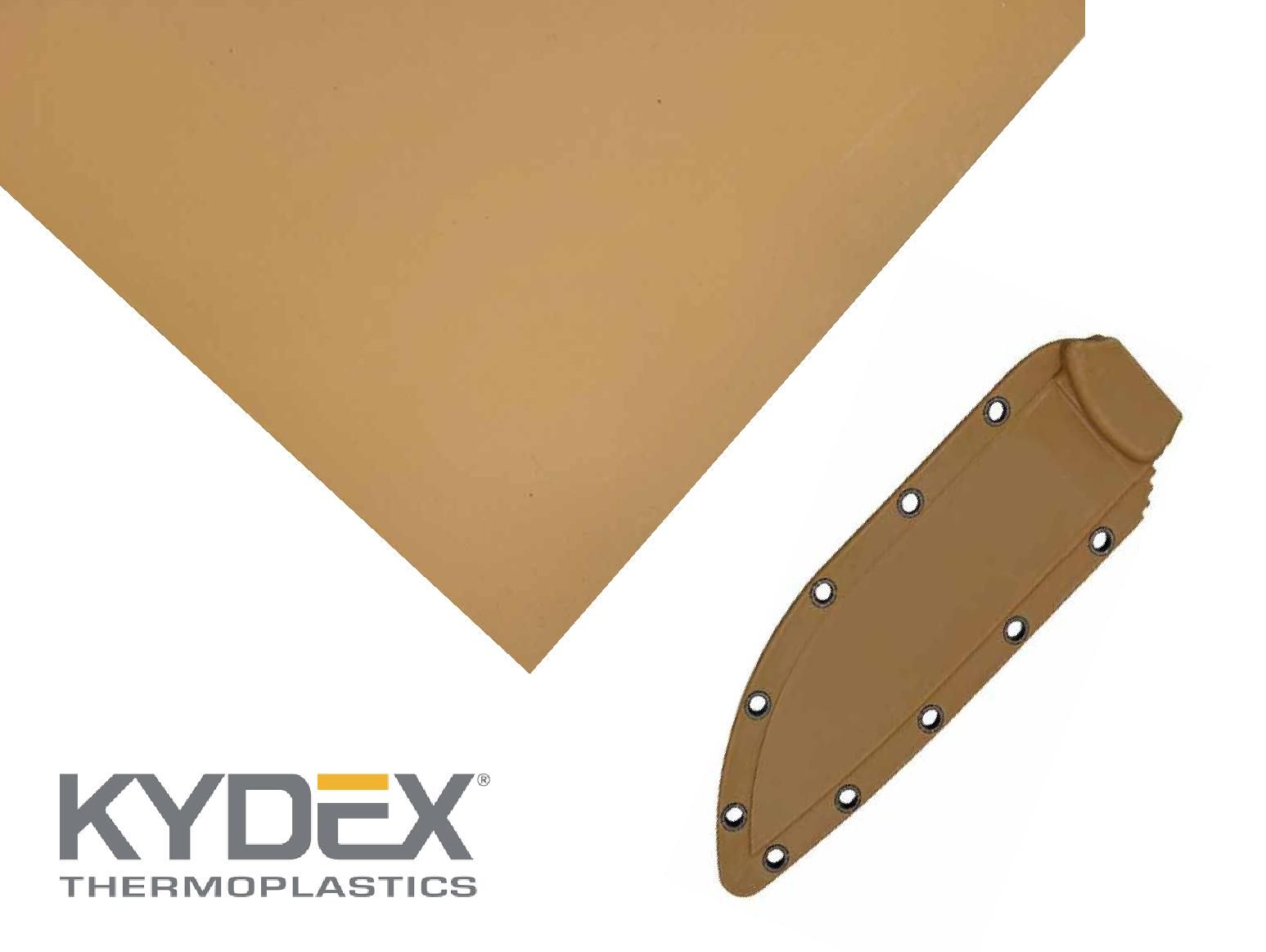 Kydex je velmi pevný syntetický materiál používaný v mnoha odvětvích průmyslu, například pro výrobu sedadel do automobilů a to hlavně pro svoji vysokou pružnost a pevnost. Proto je také vhodný na výrobu pouzder zbraní a nožů. Kydex je tvarovatelný za tepla při teplotě 160C nahřát se dá v troubě, nebo horkovzdušnou pistolí. Prodáváme pouze originální KYDEX® vyrobený v USA!