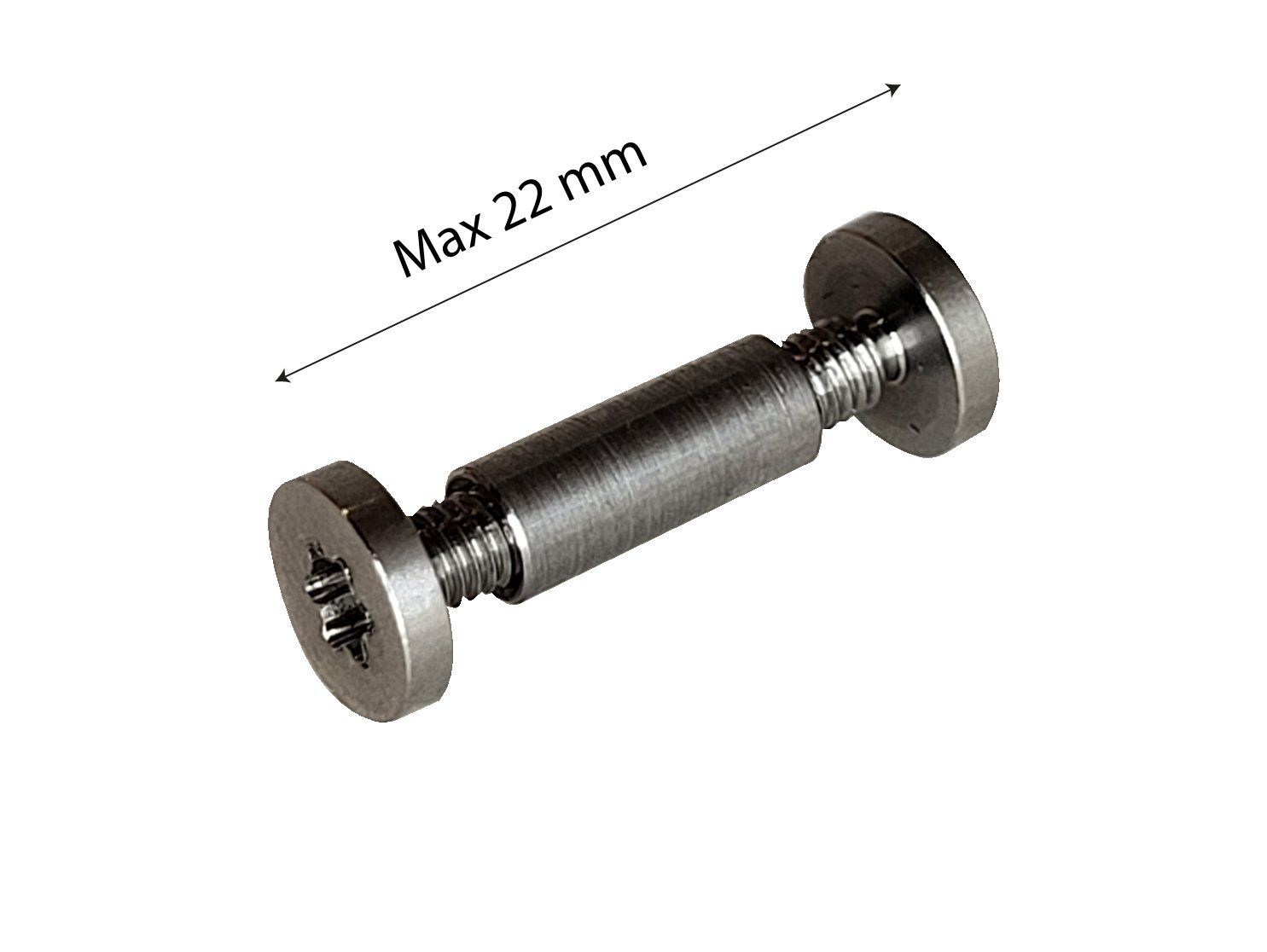 Stainless steel centre pin diameter 4 mm with M3 thread and length 10mm. 2 bronze M3 screws with head diameter 7 mm. Total length before tightening is 22 mm. Torx T15.