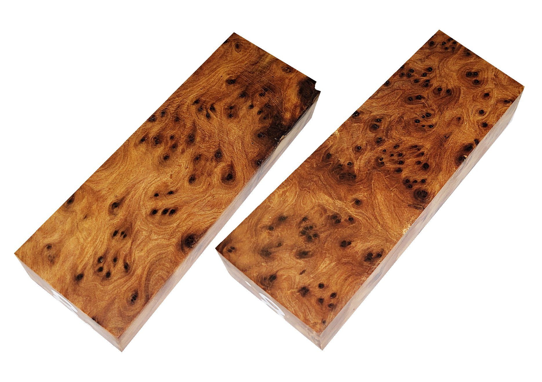 Expressive wood with a lemony aroma and a beautiful dark root pattern. Good to work with and retains resin for a long time. Knives made from thuja are highly sought after and are suited to luxury steels, especially damascus.