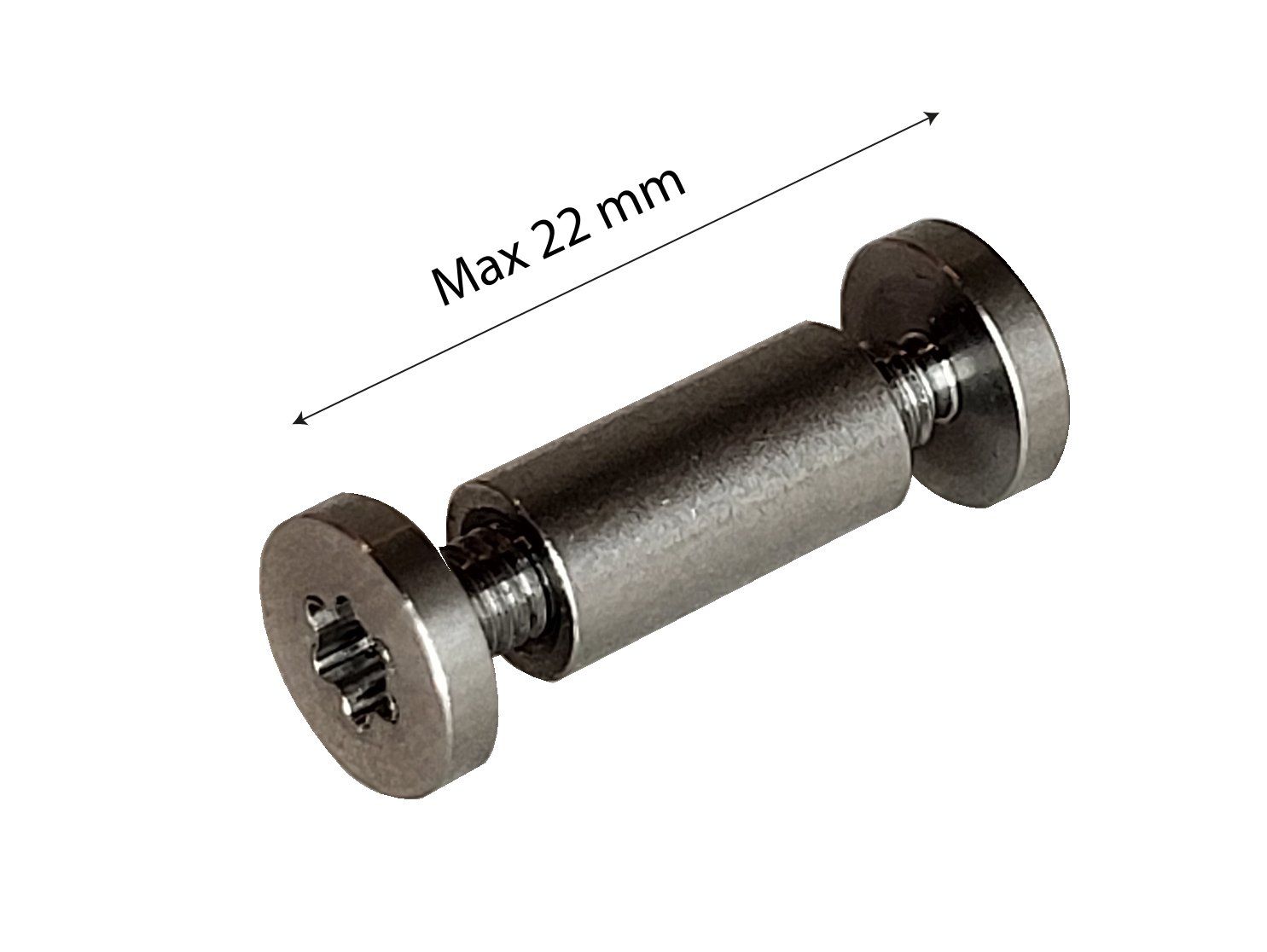 Nerezový středový čep průměru 5 mm se závitem M3 a délkou 10mm. 2 nerezové šrouby M3 s průměrem hlavy 7 mm. Celková délka před stažením je 22 mm. Torx T10.
