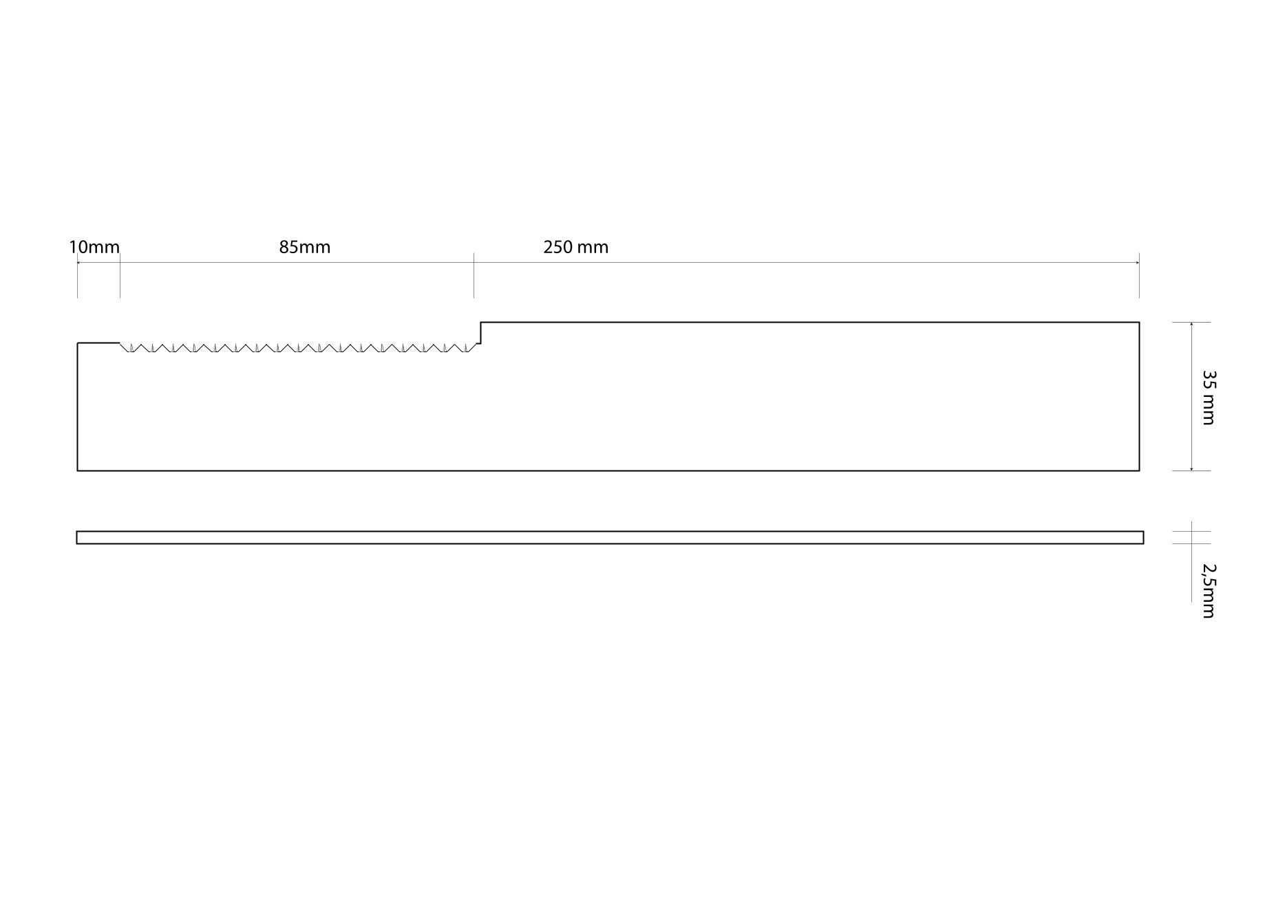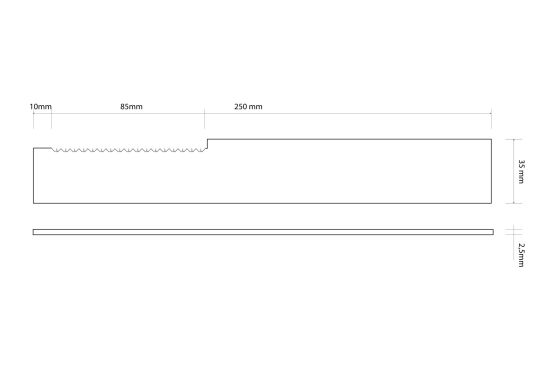 Polotovar z materiálu N690. Délka pilky je 85 mm, délka polotovaru 250 mm. Tloušťka oceli 2,5 mm a šířka 35 mm. Ocel je vyžíhaná. Použití na lovecké pilky a nože s pilkou na hřbetu. Výška zubu je cca 2mm a rozteč mezi zuby cca 5mm.