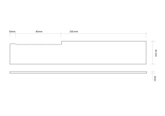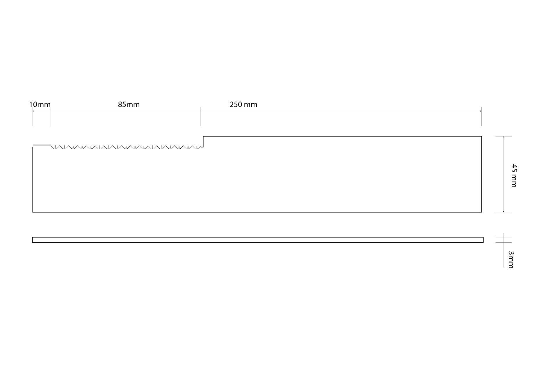 Polotovar z materiálu N690. Délka pilky je 85 mm, délka polotovaru 250 mm. Tloušťka oceli 3 mm a šířka 45 mm. Ocel je vyžíhaná. Použit lze na lovecké pilky a nože s pilkou na hřbetu. Výška zubu je cca 2mm a rozteč mezi zuby cca 5mm.