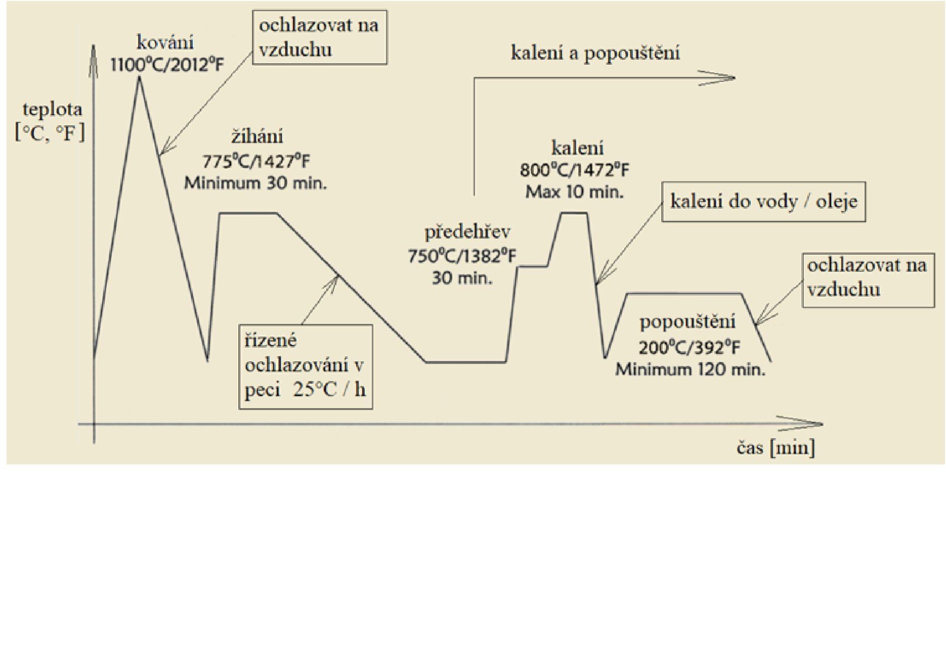 Kalení 780-820°C. Kalení v oleji (olej o teplotě 50°C) nebo ve vodě (voda o teplotě 25°C)