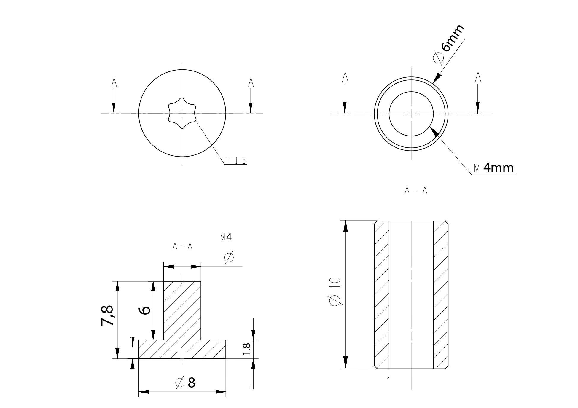Třískově obráběný a přesný nerezový středový čep průměru 6 mm se závitem M4 a délkou 10mm. 2 nerezové šrouby M4 s průměrem hlavy 8 mm. Celková délka před stažením je 23 mm od horní hrany šroubu. Torx T15.