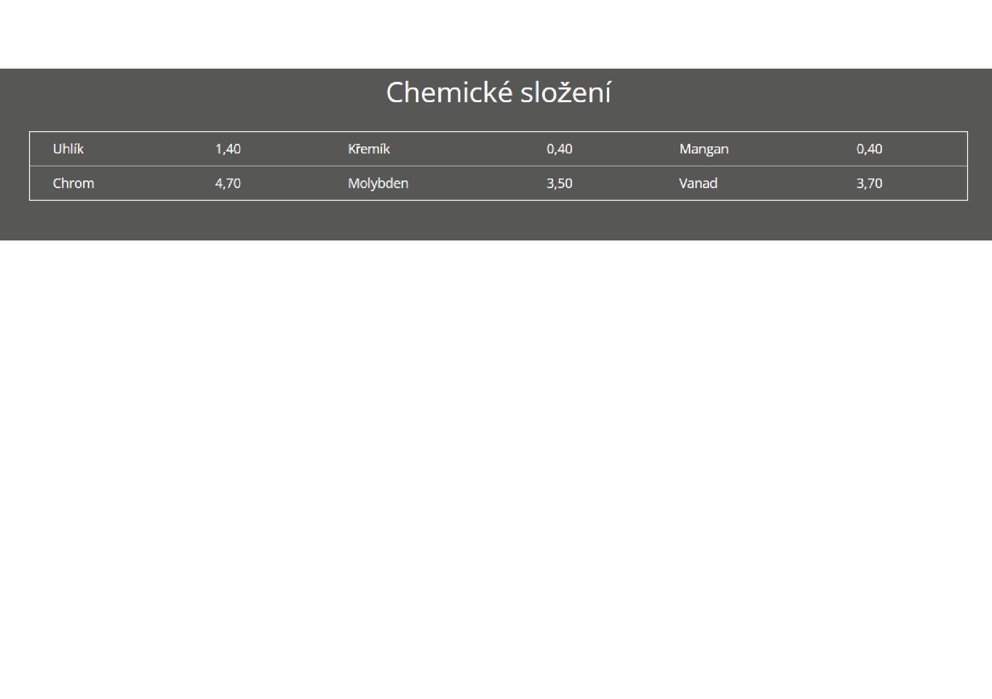 Uddeholm Vanadis 4 Extra SuperClean je v současnosti nejvšestrannější nástrojová PM ocel na trhu, která kombinuje vysokou odolnost proti opotřebení s velmi dobrou tažností a odolností proti vylamování ostří. Vynikající obrobitelnost v žíhaném i kaleném stavu zajišťuje výhody při dobrušování ostří po kalení a usnadňuje odstranění nedostatků po broušení na brusce. Ocel není korozivzdorná, nicméně nepodléhá snadno hloubkové korozi. Tvrdost námi kalených čepelí z této oceli dosahuje cca 62 HRC.