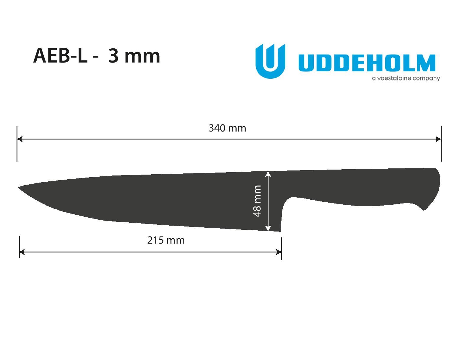 Tento výpalek je vyrobený z korozivzdorné oceli AEB-L, která po zakalení získá tvrdost 61-62 HRC. Výpalek není zakalený, je nutné ho po vybroušení zakalit. Je možné si ho nechat zakalit a poté vybrušovat na pásové brusce. Předejde se pak deformcím při kalení. Při tloušťce 3 mm a velikosti čepele zvažte, zda je ostří nutné předbrousit před tepelným zpracováním! Objednat si kalení za výhodnou cenu ve vakuu a popuštění na výslednou tvrdost můžete zde: Kelaní čepele